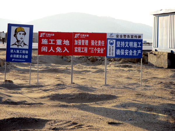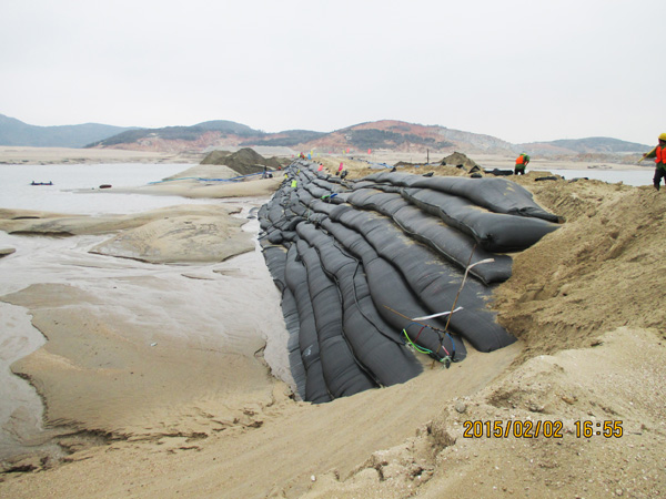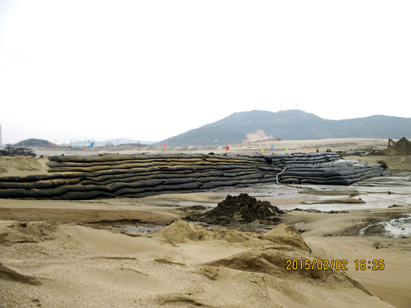 平潭綜合實驗區,主島為海壇島,位于福建省東部,與臺灣隔海相望,是中國大陸距離臺灣島最近的地方,是中國第五大島,有福建的“馬爾代夫”之稱。平潭綜合實驗區如意湖防潮閘工程項目總投資1.3億元,我公司承建的土建工程包括排澇閘、防潮閘、公路橋、上下游兩岸翼墻、防沖消能、控制房等土建工程施工(含導流明渠開挖、圍堰填筑)。平潭(簡稱嵐)年平均風速超過五級以上,大風呼嘯,沒來這里感受不到風有多大!依據工程設計及進度要求,在落差8m潮汐中的軟基上進行圍堰模袋充砂以截流海水,在惡劣地質條件的海中建閘,與潮水賽跑、跟臺風搶工期,潮起潮落,給工程建設平添了許多艱難與艱辛。