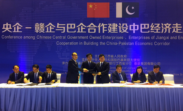 公司董事長王元旦與中國進出口銀行江西省分行、中國葛洲壩集團國際工程有限公司簽署巴基斯坦開伯爾-普赫圖赫瓦省350MW瑞開水電站項目戰(zhàn)略合作協(xié)議