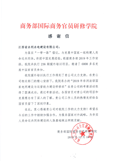 人力資源2019年,公司圍繞國(guó)家和我省“走出去”戰(zhàn)略,積極配合商務(wù)部及省內(nèi)援外培訓(xùn)工作,得到各方認(rèn)可。近日,公司收到來(lái)自商務(wù)部國(guó)際商務(wù)官員研修學(xué)院的感謝信,信中提到,商務(wù)部研修學(xué)院援外培訓(xùn)工作得到我公司的大力支持,“2019年非洲法語(yǔ)國(guó)家電網(wǎng)建設(shè)與運(yùn)營(yíng)能力建設(shè)研修班”考察、交流活動(dòng)取得圓滿成功,對(duì)公司的積極配合表示衷心感謝。