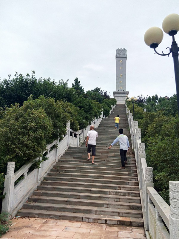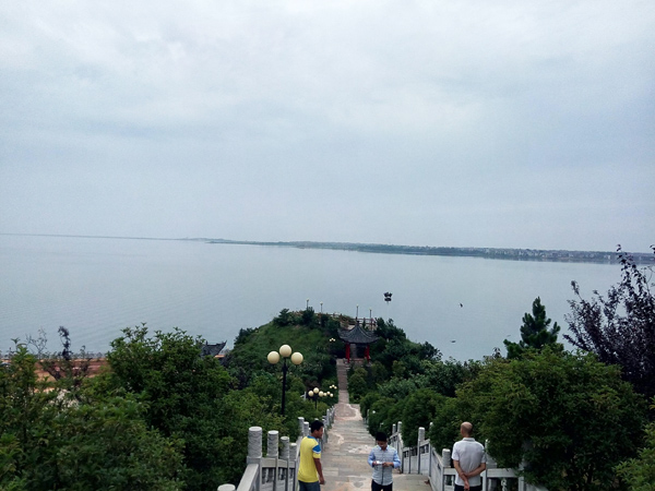 除了饒娥像,其對面的斗笠山也是美景所在之處。入山前,首先看到的是一條由青石板鋪成的臺階,臺階蜿蜒陡峭,兩側(cè)是漢白玉雕欄,欄上雕龍繪鳳,栩栩如生。抬頭仰望,只見臺階盡頭是一座高聳的石碑,燙金而書“天下第一碑”幾個大字。一路走走停停到了石碑前,眼前豁然開朗,放眼瞭望,到處一片茫茫水面,碧波蕩漾,翻起碎玉點點。窮極目力,水天一線之間,一座三角錐狀燈塔若隱若現(xiàn),“浩渺鄱湖水接天,波翻浪涌競爭先;連江通海胸懷廣,滋養(yǎng)生靈歲復(fù)年。”余老的《鄱陽頌》誠不欺我。臺階中央又有一小平臺,連接至一片紅墻黃瓦的走廊,廊前紅墻上鑲嵌著墨色的石板,上面刻著一些當(dāng)代大家對鄱陽湖的見聞和贊譽(yù),筆走龍蛇,字體蒼勁,令人賞心悅目之時不免肅然起敬。走下斗笠山,已經(jīng)接近傍晚,金日西斜,站在饒娥像后眺望,湖面一片金鱗銀濤,美如油畫。