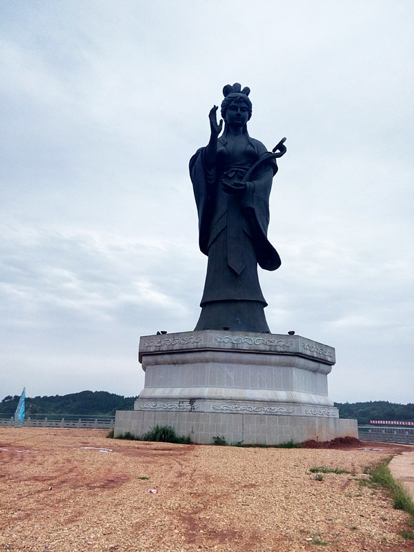 沿著岸邊的鵝卵石小道,我們一路前行至一座仿古的小橋前,橋面由木板鋪就,木板涂滿紅漆,煞是鮮艷惹人。對比之下,混凝土做成的橋梁則彰顯含蓄,而表面雕琢出類似年輪的紋理,使橋梁更顯內(nèi)斂深沉,又不覺突兀。小橋兩側(cè)的欄桿由木條構(gòu)成,上面卻是橙黃的漆面,雕有花草鳥石,十分精細(xì)。走過木橋,再行穿廊過巷,出現(xiàn)在眼前的便是一座近30米高的古代女子雕像,雕像呈深灰色,坐落于八棱型花崗巖底座上。女子鵝蛋臉型,梳著唐朝云髻,頭頂六瓣花飾,身著寬袖宮裝,右手豎起手印,左手平托一如意,背朝鄱陽湖,臉朝對面的斗笠山。走近細(xì)看,底座上有漢白玉板,上面書寫了女子姓名與生平,這是著名的“饒娥像”。